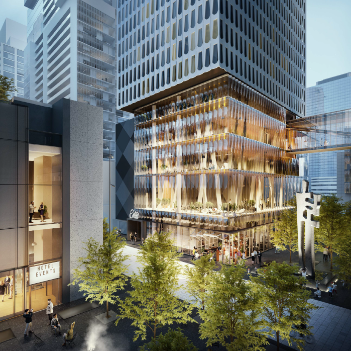 Having taken a look at the new plan, there's a lot to like in the materials (finally getting scalloped glass somewhere in this city is exciting) and the POPS connections, but I'd like to share an idea on how I think the dedicated park space could be better integrated and activate the area as a whole to make it vibrant and exciting.