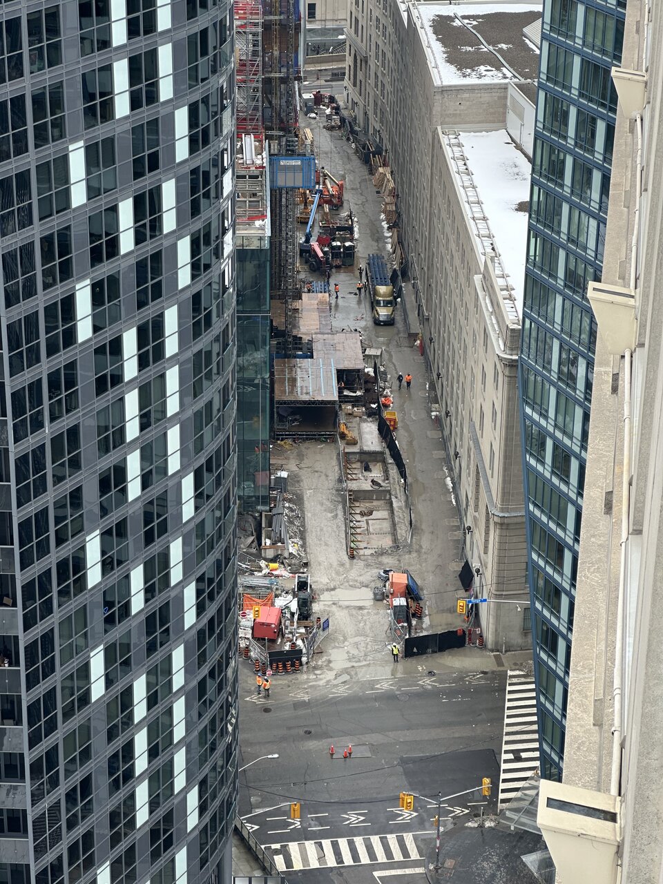 Hard to see what’s changed up top. The top underside roof was not fireproofed but the yellow panels are coming down I assume so the glazing can continue on pace. Maybe temporary hoarding will be installed on the top level.