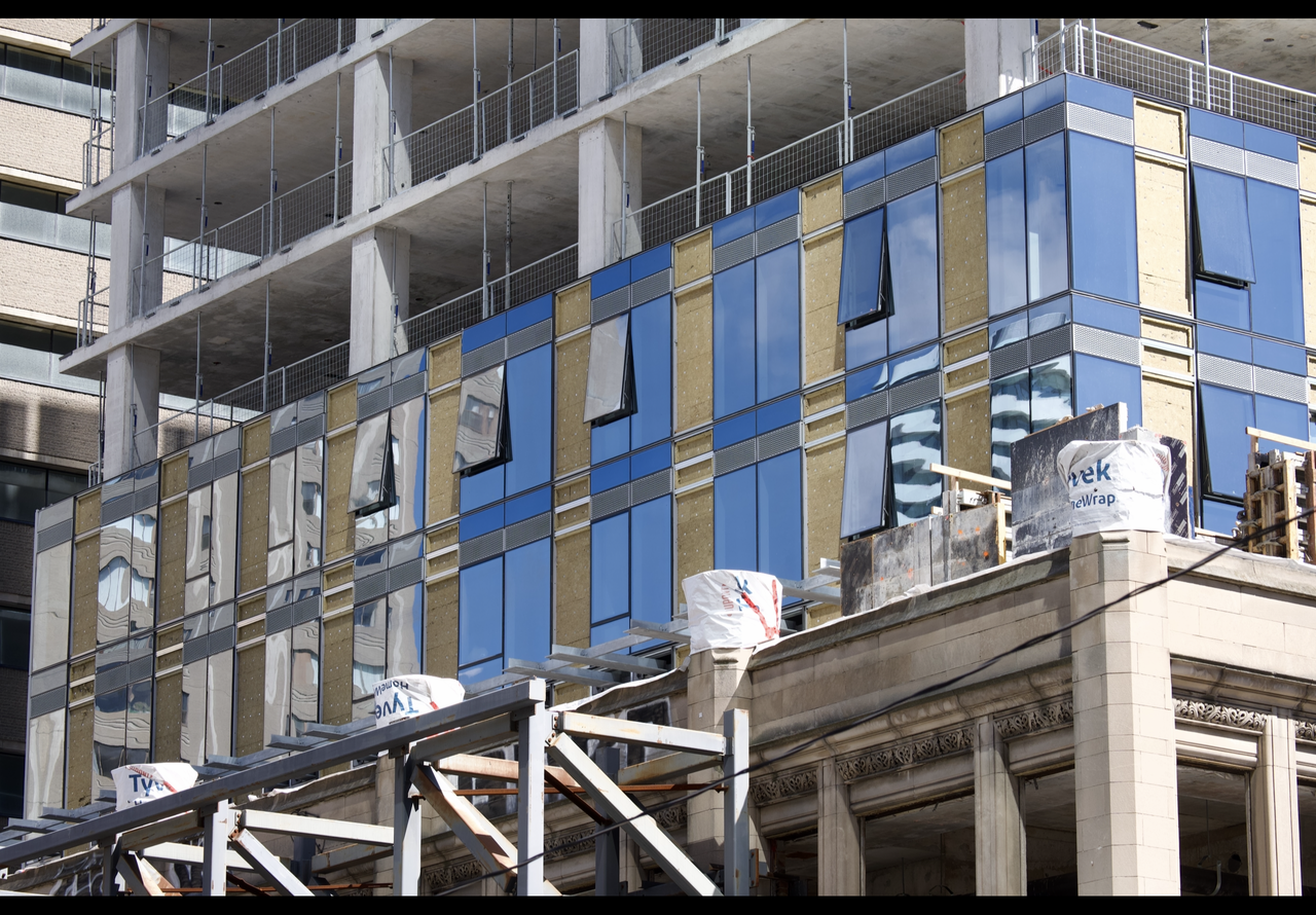 The architectural drawings make it look like it will be a stone-like material with some faux-windows.Great pics! Will the spandrel be the same reflective glass as the rest of the curtain wall?