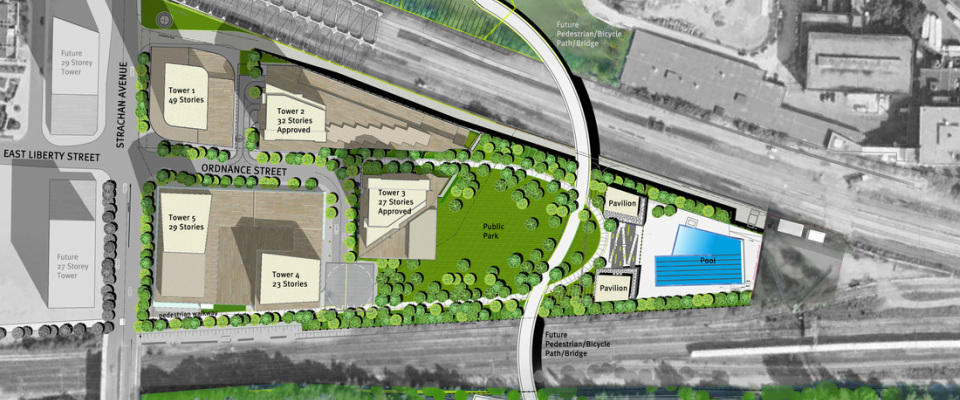 I looked at the plans and they show five lots to be developed here but only four buildings are currently in play. Does anyone know if they will still be building another tower at the Tower 1 plot? I hope not as it's pretty dense already with the buildings just across the street on the west side of Strachan. Leaving that space open with some greenery or public art would work well in that area i think. I realize there is a public park in the back but you don't see it from Strachan so something nice there would be great for pedestrians, cyclists and even cars to see when passing through.