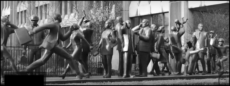 If the faces of the numerous pedestrians milling about in the picture seem incredibly life-like, this is no accident. Bell-Smith set out to create a documentary atmosphere by incorporating real people with whom he was familiar, both professionally and personally. The helmeted policeman, draped in his rain cape and directing traffic, is Constable John William Redford from the Toronto Police Force. Redford was a regular fixture at the corner of King and Yonge, routinely directing traffic as depicted in the painting. Upon retiring from the force, he worked as a security guard for the Simpsons department store on Queen Street at Yonge. Two other significant people are portrayed elsewhere: the gentlemen being swamped by newspaper boys is the artist himself, and the man seen raising his hat in greeting to the women passing by is Bell-Smith’s son, the Reverend F.M. Bell-Smith.
