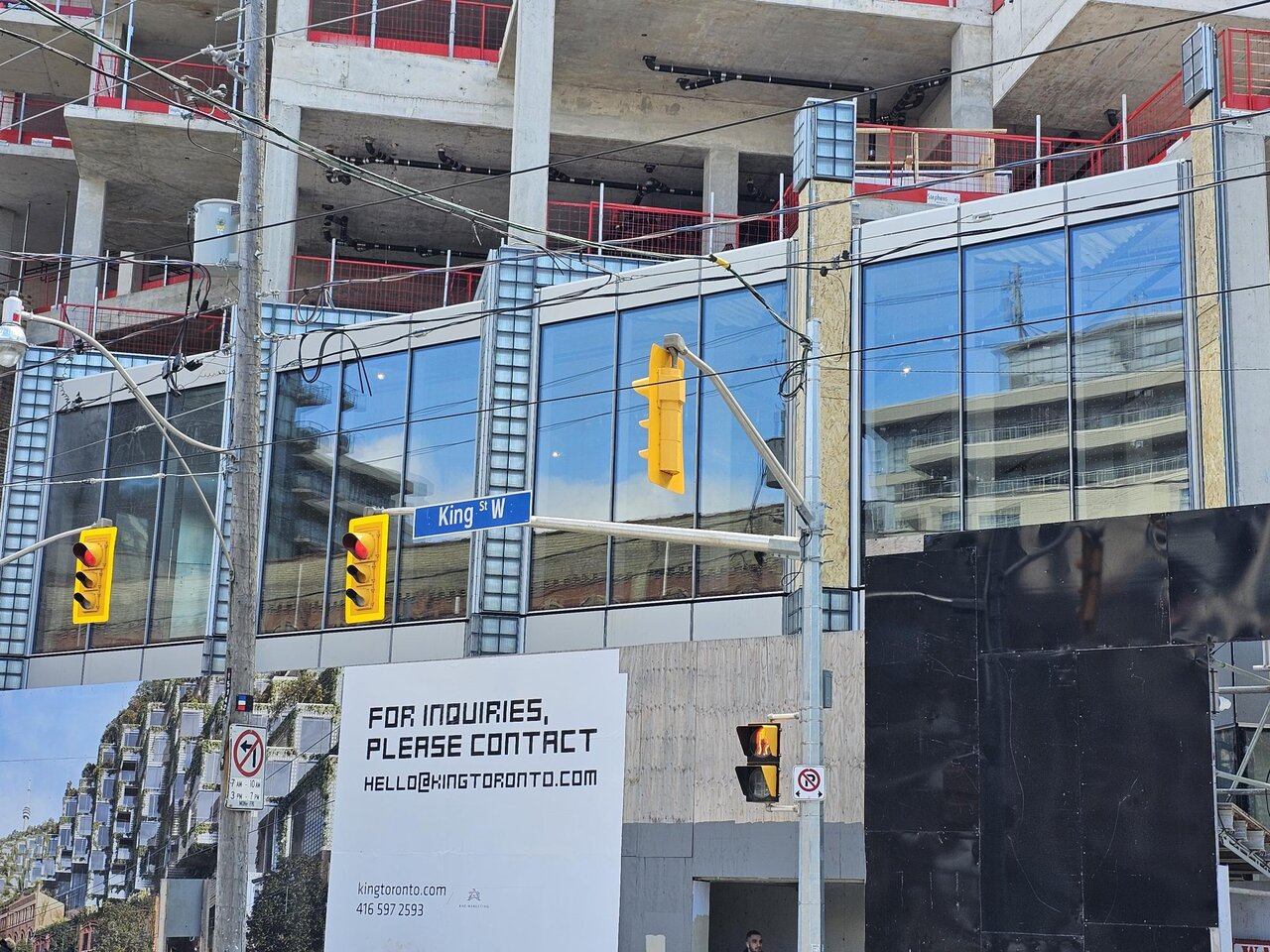 Thursday, April 3 - cladding and glazing installation work going on both front and back of the King Toronto building. First, on the King Street facade, new sections being installed on the north-east corner, with the spyder crane back in action. Then pre-installation set-up work being done in the rear facade, south east corner. Finally, some newly delivered sections staged in the south-west corner of the property, waiting on installation.