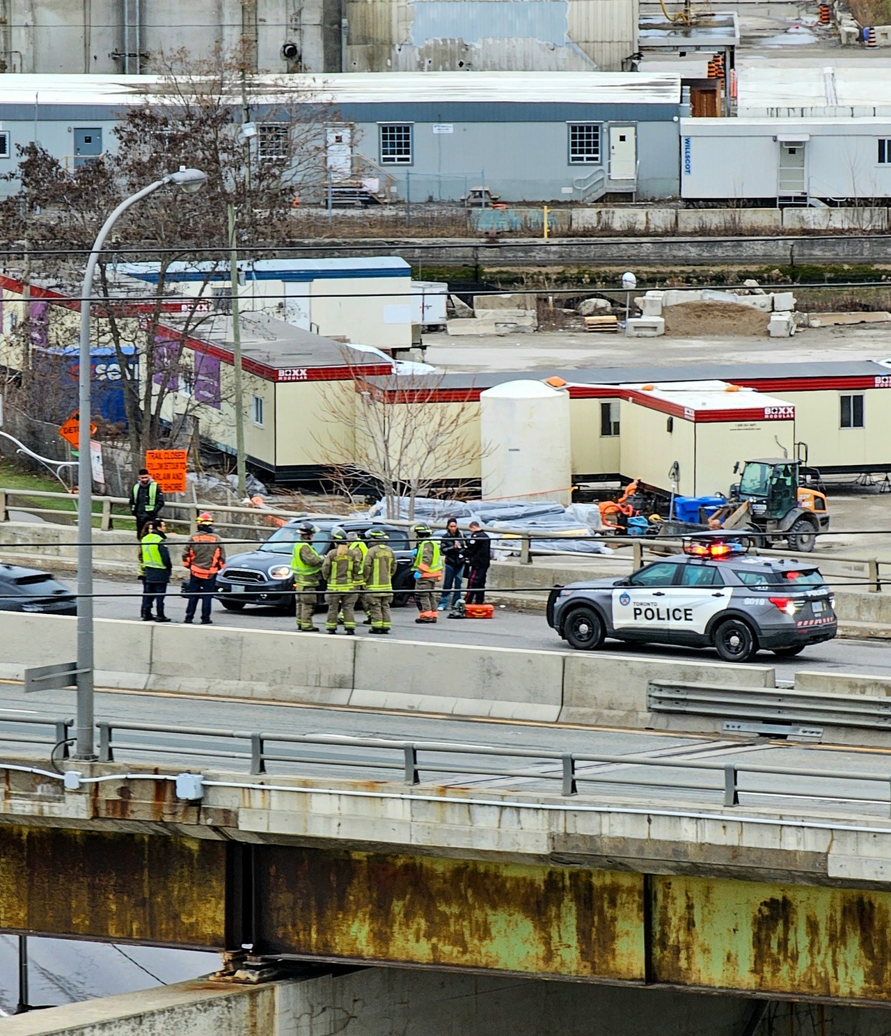 With regards to the realignment / reconfiguration of the Gardiner Expressway East as mentioned in earlier posts ... ever since they demolished the ramp there have been accidents on an almost daily basis, at exactly the same spot in front of our balcony (eastbound above Cherry St.). It seems vehicles hastily merging left to avoid the ramp closure are succeptible to this (see the poorly constructed barrier in the 3rd photo).