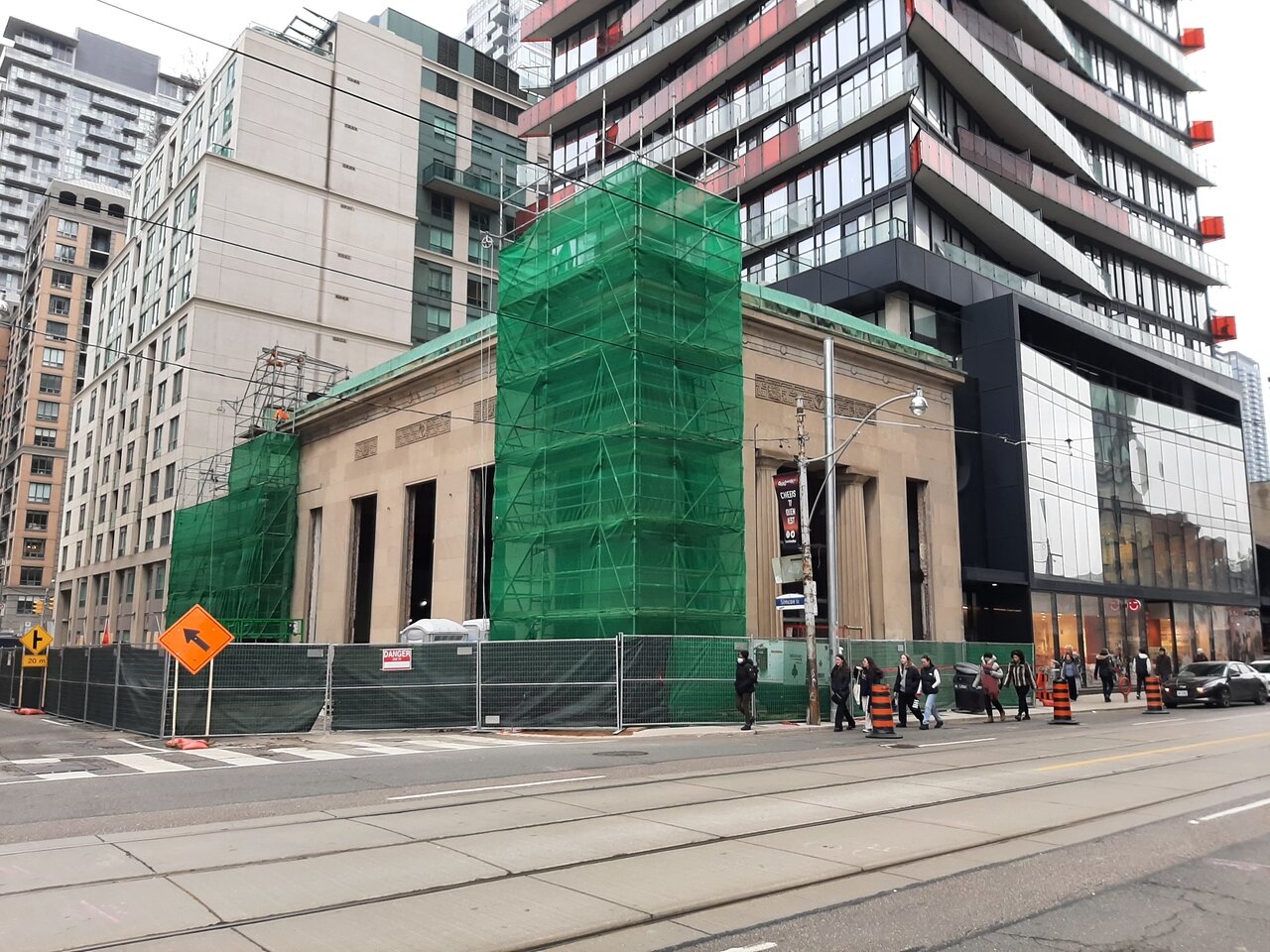 I wasn't sure to put this, so I'm putting it here. I took this yesterday as I passed by the old bank building west of Osgoode station, on Queen. The crews have been busy working at the building, which is pretty thoroughly gutted by now.