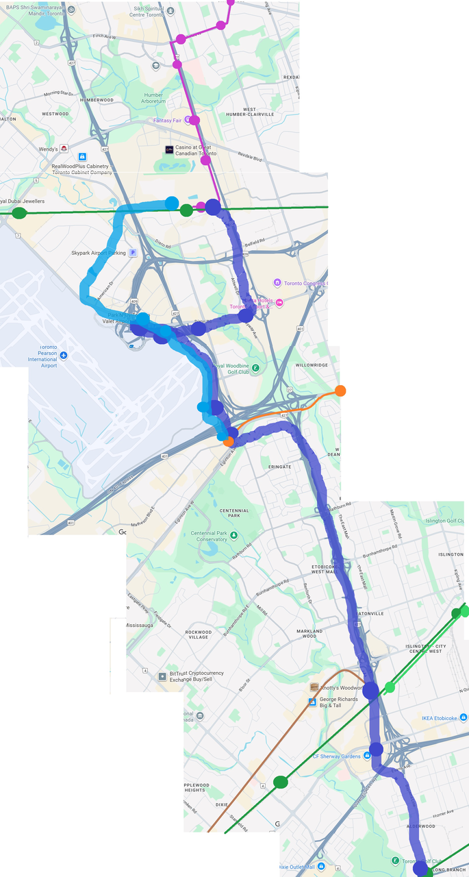 Dark Blue shows a BRT Lite connecting Woodbine (Line F and KW-GO), YYZ, Renforth (Line E), Dundas (and extended Line B and future Dundas BRT with some sort of pedestrian bridge/moving sideway connecting the 2 sides of 427), Sherway and Long Bridge (LSE-GO). Maybe this can be built sooner.