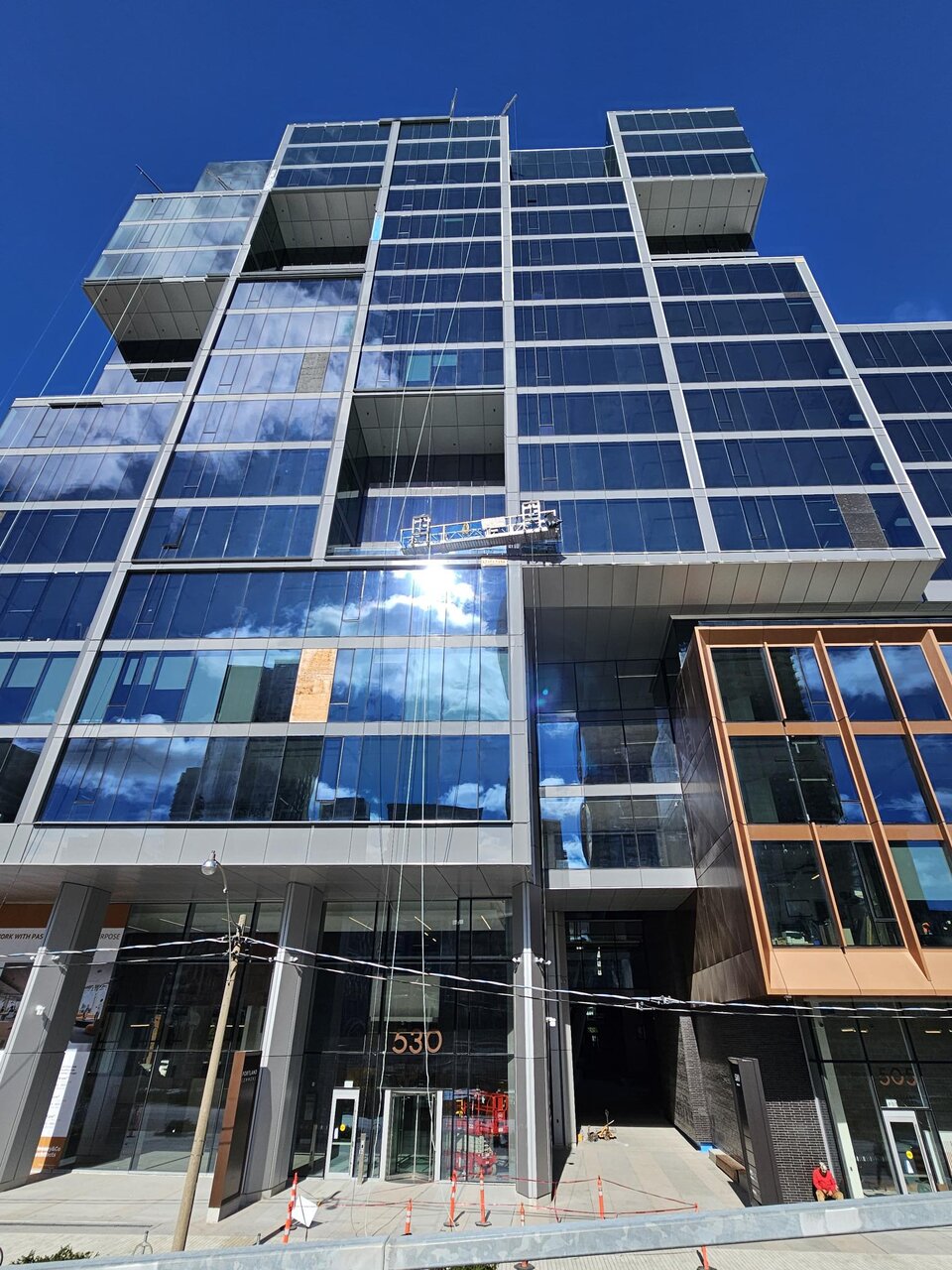Three overview photos, and then some more detailed pictures. The sidewalk and walkway areas are looking good, with some benches now installed. No visible progress on installation of the missing / broken cladding and glazing sections yet. One solitary window washer can be seen at the north-west corner of the building in the photo immediately below.