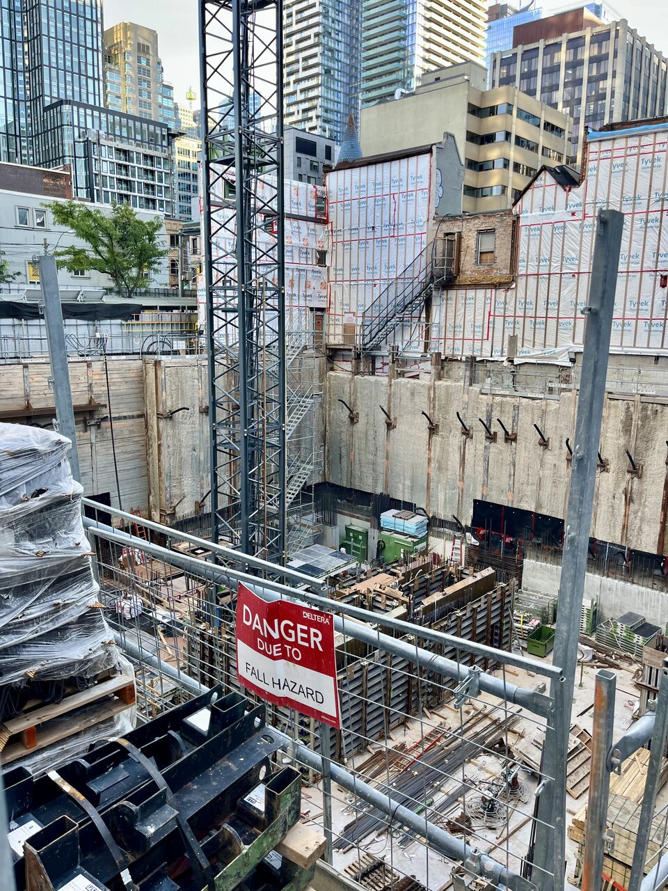 My guess is that's the site office. Those facades facing Church are getting integrated into the final project so this temp stair is just to facilitate access while the future building isn't yet there.