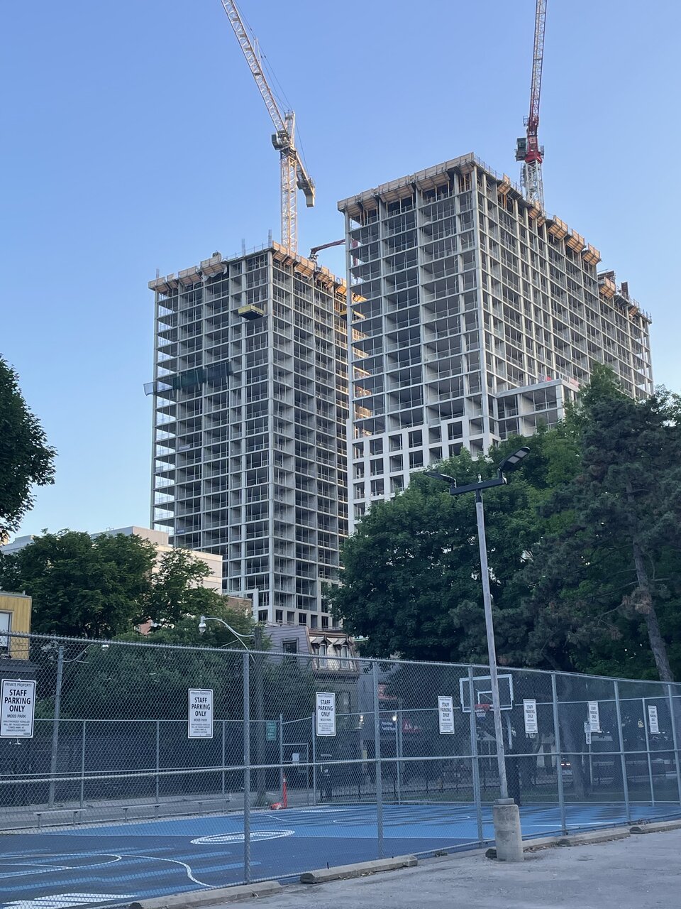 That crane was in use well past 9pm last evening, and it was hoisting up the sand coloured pieces that frame the windows. The main cranes are still part of the towers this morning.