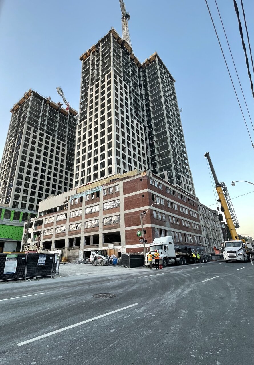 Yes, those shots were taken around 9 pm. There were workers and a stretch of Richmond in front of the site was down to one lane. I didn’t see them lifting the precast panels, but I saw a section of crane dangling on the yellow derrick(?) on the flatbed truck. Further down, there was a second flatbed truck with precast panels on it.