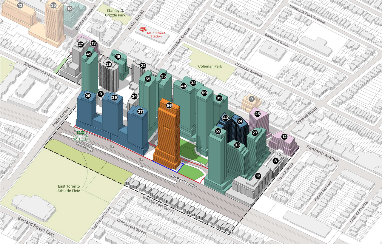 Also noted is a modest expansion of Coleman Park across Danforth, the principle reason for that is not a park expansion which would be a small, incidental benefit, but rather, to accommodate a new entry to Main Station which could be either direct to Platform or to the concourse level. But since that would be adjacent to the existing park and leave only one or two houses, I say remove them all, and redesign as a cohesive space.