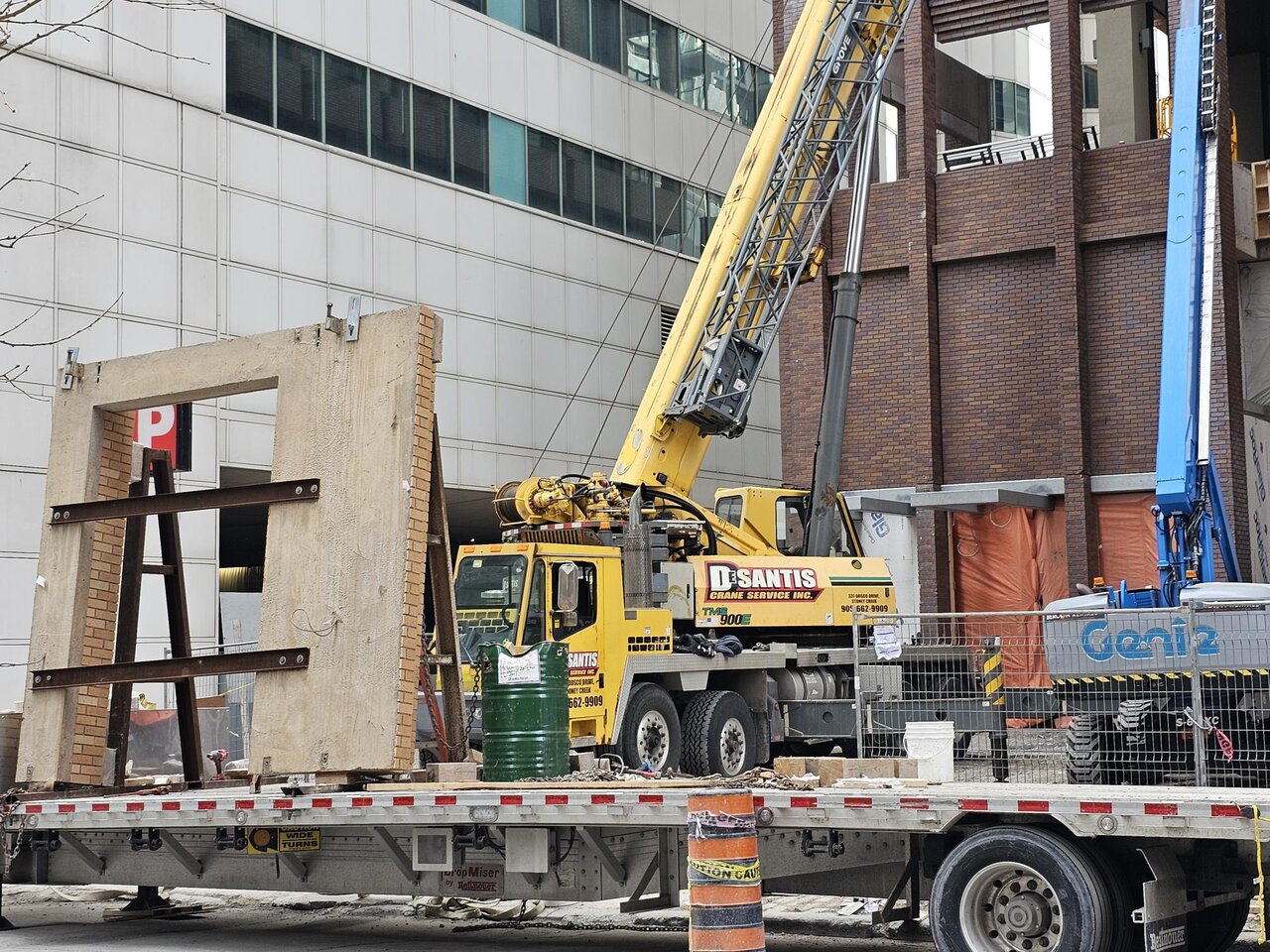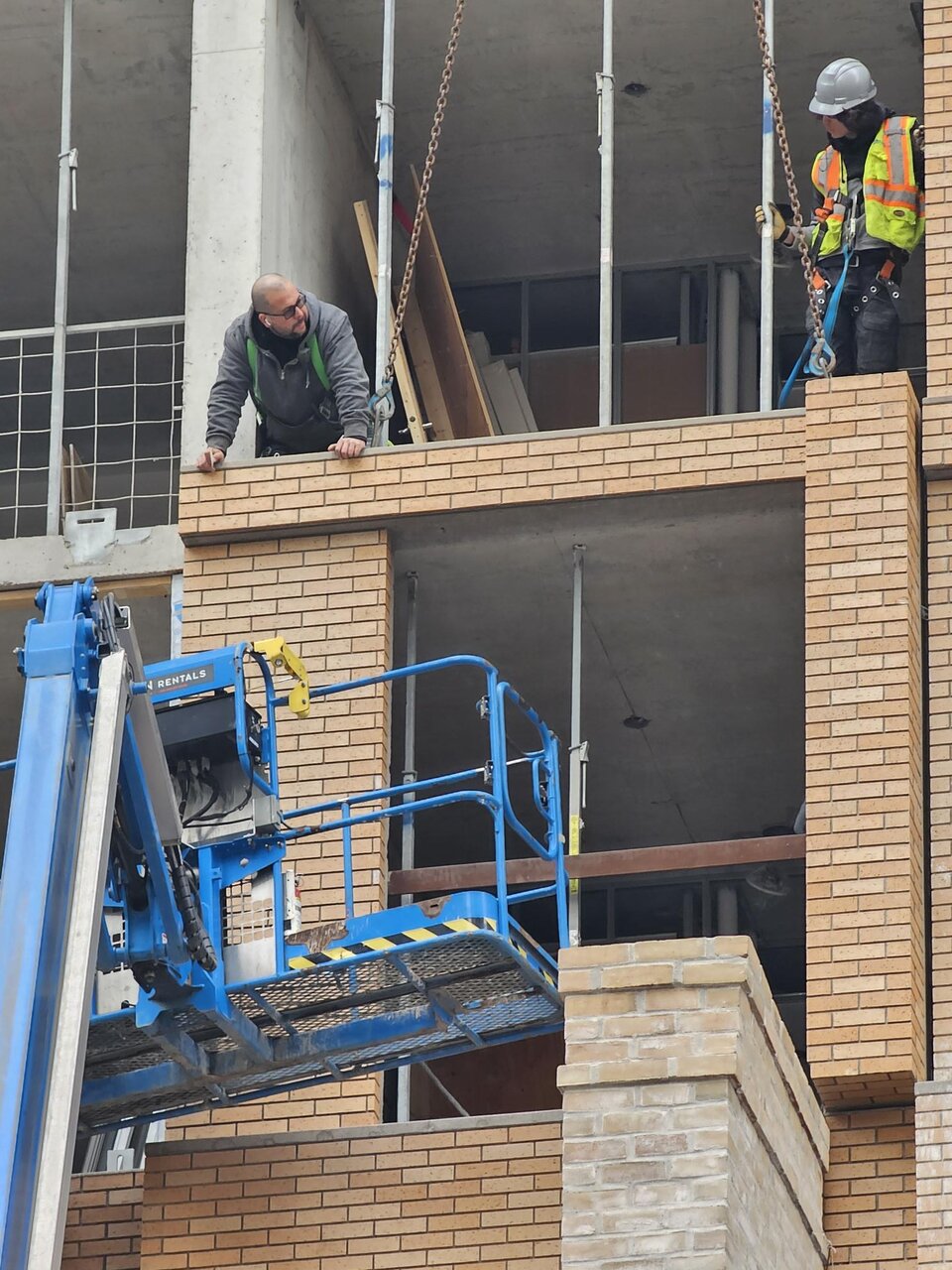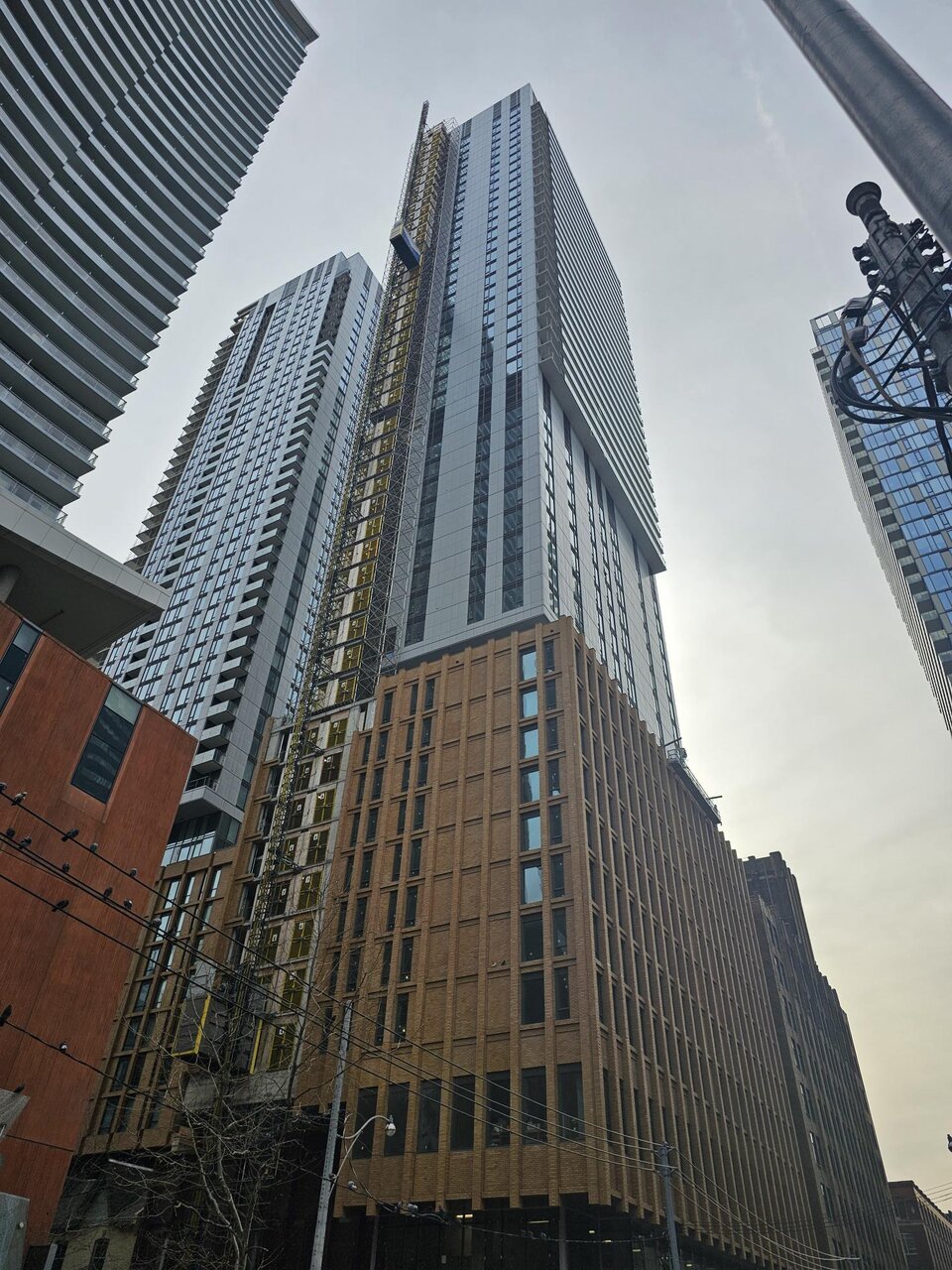 Good progress in enclosing the south building podium where the external construction hoist used to be - just some window openings needing their glazing. The upper portion of the south building still needs a lot of work to enclose the external hoist openings. The external construction hoist for the north building is still in place and in use.