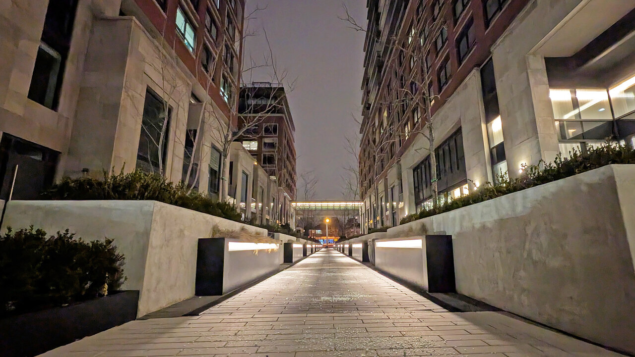 This is the sort of intimate, pedestrian walkway that you'd expect in a waterfront district. There's nothing like this on Queens Quay East except for a single cozy space (the little dog park) that appears to have happened by accident.