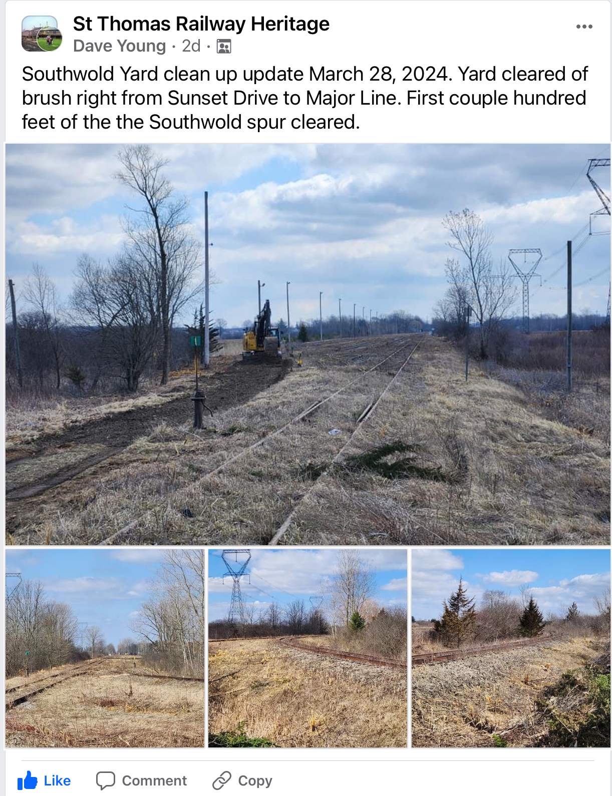 Found this on Facebook. CN is cleaning up its old Paynes Sub in St. Thomas. It was completely overgrown and impassable in recent years. It connects to the opposite side of St. Thomas from the VW plant, but has an old yard on it. CN might be planning to use it to store or marshal cars for the plant.