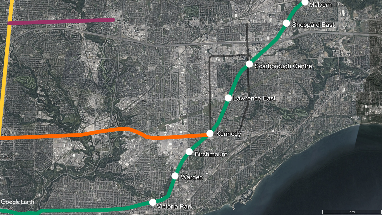 Made a little map showing what the Bloor-Danforth in Scarborough could have looked like had the old Candadian Northern right-of-way not been developed over.