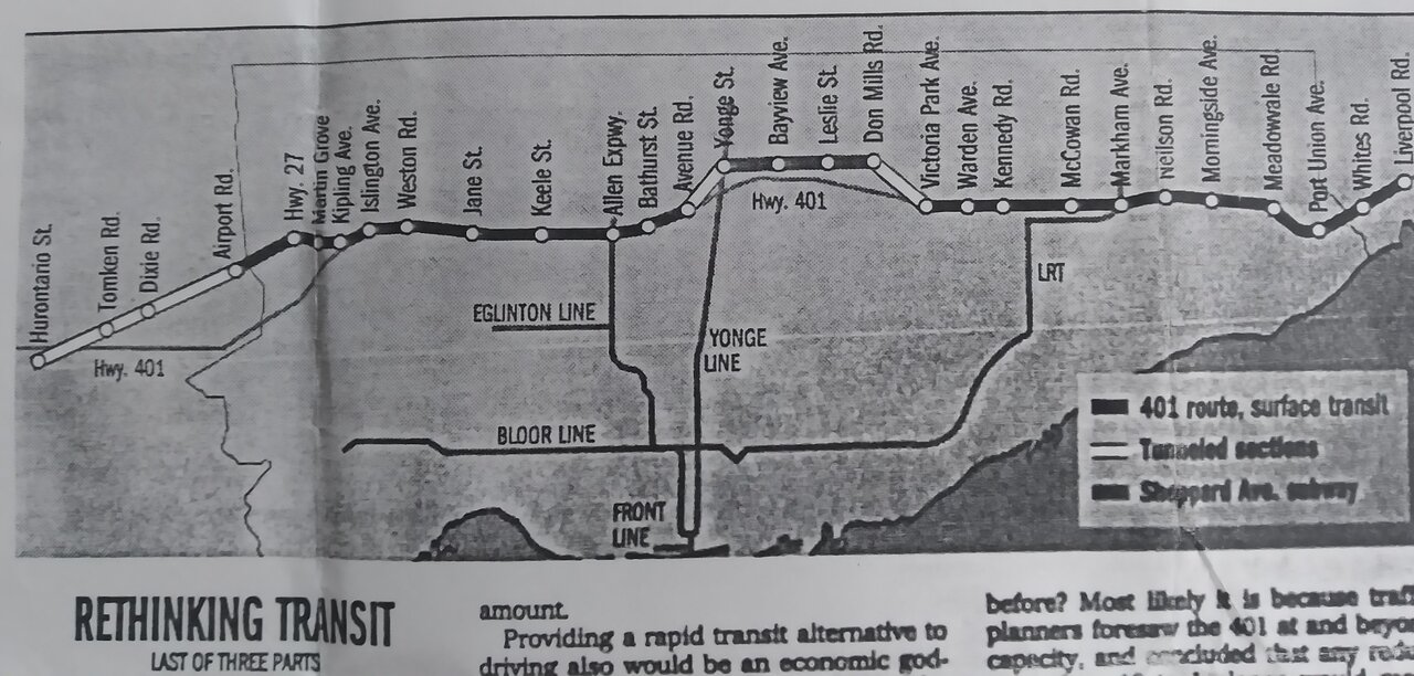 didn't have a similar idea when purported sane grown-ups actually started talking about building a road tunnel underneath it. The scheme doesn't entirely make sense, as sticking to the highway would miss key transit stations like Wilson, though it would have been easy to make a junction with the SRT, which was less than 10 years old at this point. To me it would make more sense (although running south through Downsview is logistically easier) running along Wilson to Wilson Station, from a network perspective.