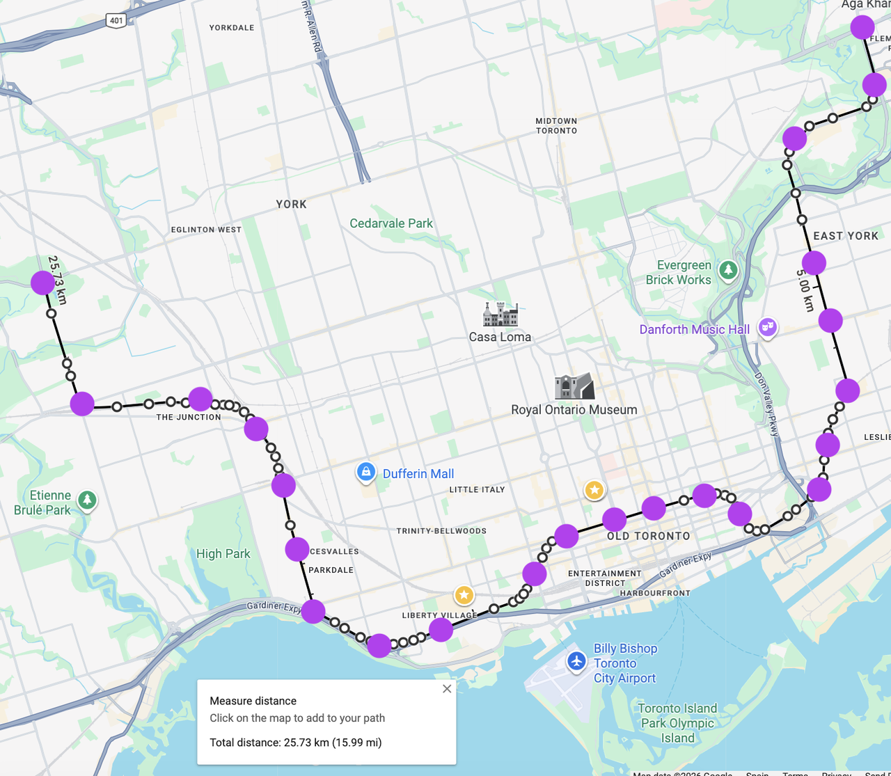 That routing is begging for northern extensions to Don Mills (Line 4) on the eastern side and to Pioneer Village (Line 1) on the western side!This is what I envision the full line looking like. My hope is that this would set the stage for northward extensions up to Jane and Finch on the west side and up to Steeles on the right side.