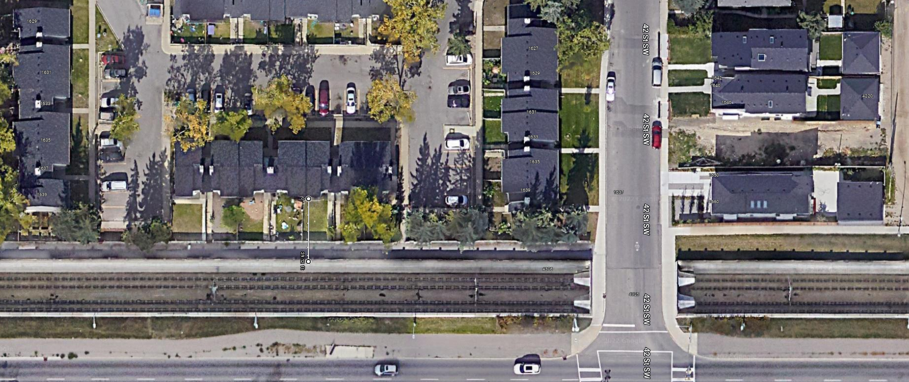The distance between the end of the track on the surface and that legal lot line is ~46M; the distance from same place (end of track) to the next visible condo building is ~180M