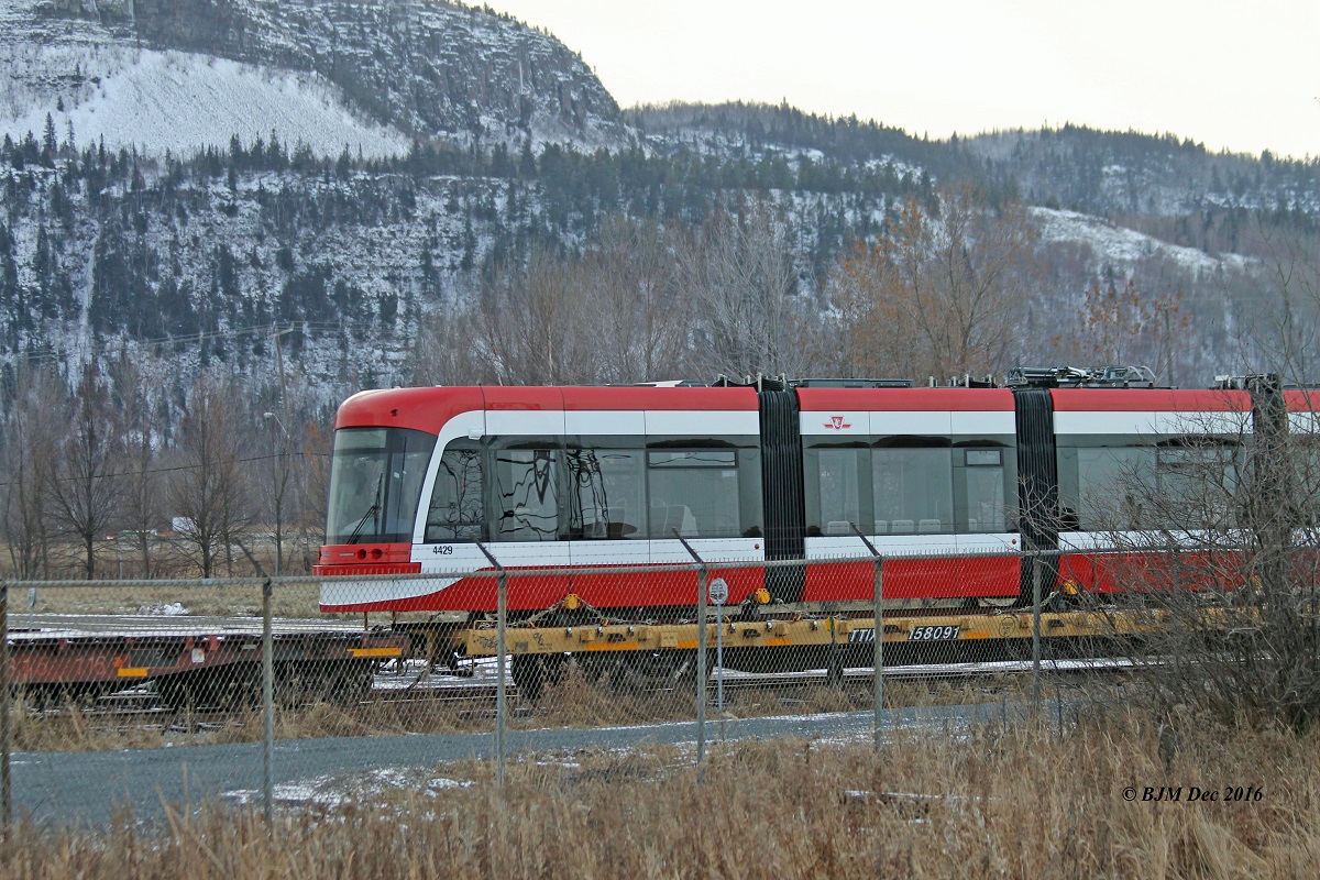 Here is TTC 4429, the 29th Flexity tram, sitting at the gate of the Bombardier plant in Thunder Bay, this afternoon, Friday, December 9th, 2016. GO 358 the next CEM cab car to be delivered is also at the gate. The CP switcher will pick them up and transfer them downtown to "E" yard, where they will be staged for pickup by CP Train 420. Bryan Martyniuk photo with permission.