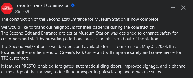 Museum Station Second Exit opens tomorrow, May 31st, 2024: (images suggest it is actually open now)