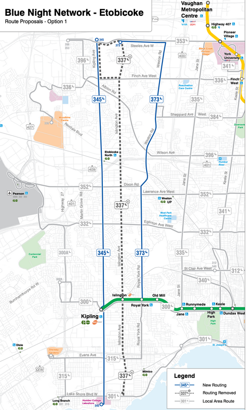 I suggested that adding Kipling was good, but removing Islington was suspect and to proceed w/caution. I noted that its removal also adversely affected connections from Lakeshore to Bloor (overnight) east of Kipling.