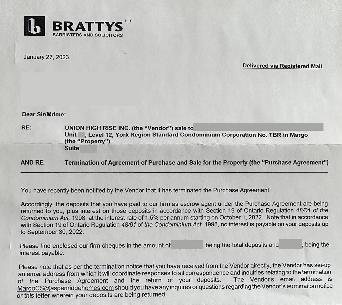 Honestly, I've been waiting for some type of news about this project for a long time. When you see all the condo construction going on in the city post-Covid, and how the Margo site still sits empty after all this time (I drive by to check occasionally), I have always wondered what was really going on with this project. Any construction project requires a large amount of money and with inflation, increased costs and labour now, maybe Aspen Ridge has just decided to terminate. Too much uncertainty maybe? We may never find out the truth, but I'm sure buyers don't expect the Builder to accept the deposits and then keep delaying and delaying and delaying the project for years. All this time without any formal updates.Aspen Ridge is sending out termination letters to all those who bought at Margo. Wonder if there will be fair compensation or a class action law suit?