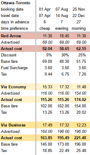 Here were the advertised prices for when I was booking the intervening 3 trips I took to Toronto by bus or train: