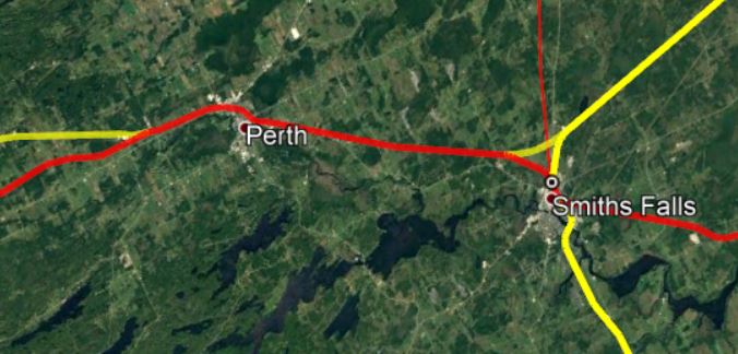 For the 15 kilometres from Glen Tay to Smiths Falls, the route follows CP’s main line. Given that the whole point of the HFR project is to avoid interference from freight trains, this segment will need a new ROW, whether it be adjacent to the CP line, or along a completely different route.