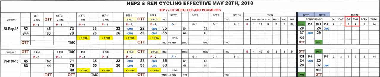 This cycling plan clearly shows a total of only 10 revenue Renaissance cars in service (8 Economy plus 2 Business) at any time of the week and if you compare the suitcase symbol (indicating checked baggage service) on Quebec-Montreal-Ottawa services in the PDF timetables between June 2015 and March 2020, you will notice that the Renaissance cycling shown below has been virtually unchanged over the last half-decade: