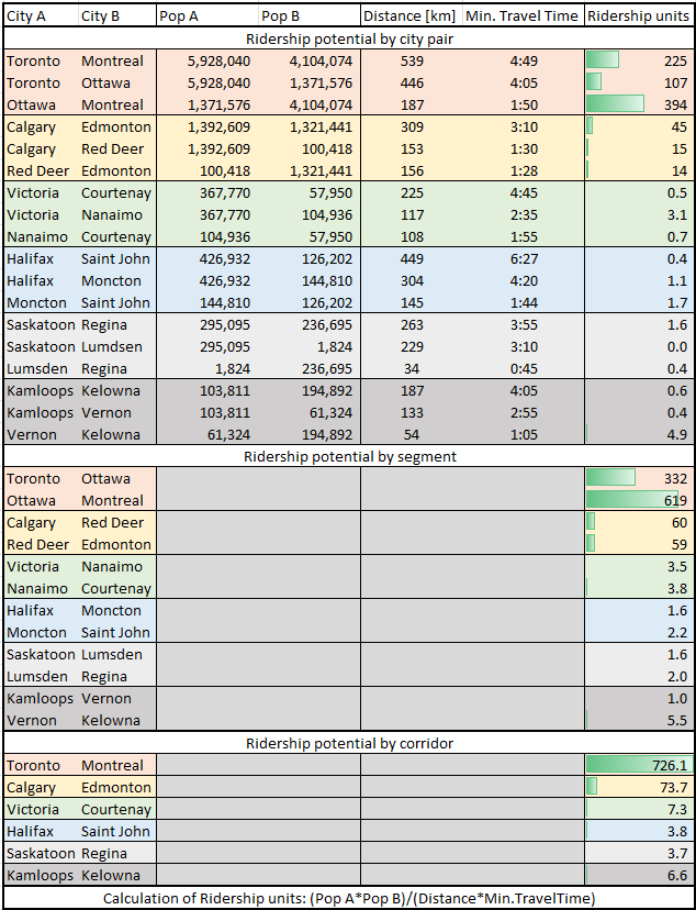 Basically, TRTO-OTTW-MTRL has approximately 10 times the ridership potential of Calgary-Edmonton and 100 (!) times the other four corridors our friend Mathew has identified...