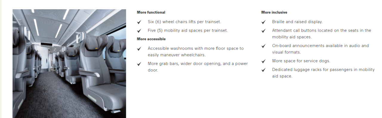 • The Short and Extra Short trains would have the business car use the Galley in the 1A car (presumably at the front of the car) and there are accessible seats and washrooms available in both classes of service (the short would have a second economy accessible car).