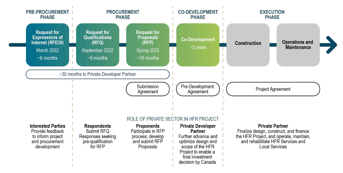 On October 31, 2022, the Government of Canada released the RFEOI update. This follows up on the RFEOI that was released March 10, 2022, to seek advice and views from industry on the High Frequency Rail project – responses were requested by May 31, 2022.