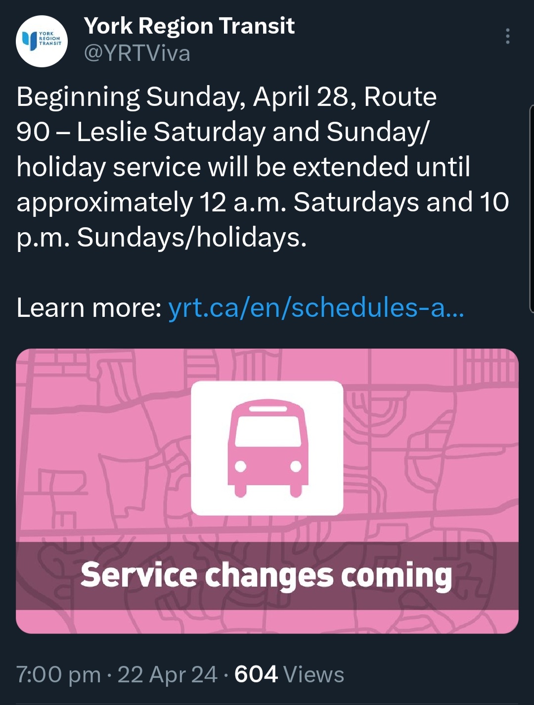 In December 2023, York Regional Council approved the 2024 budget effective on July 1, 2024. This is the first fare increase since 2019 and will help to address the rising costs of running the transit system.www.yrt.ca