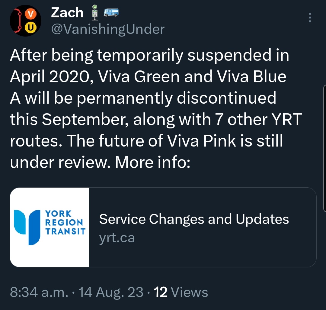 Ridership growth on Green was always problematic even before COVID. But it did have a dedicated ridership base, and those riders have been trying to make do with a substantially worse service to get to and from work than they did before. It would be nice if YRT were to actually follow through on what they claim and improve the service on the other routes serving the same area, but that's asking an awful lot of the organization.