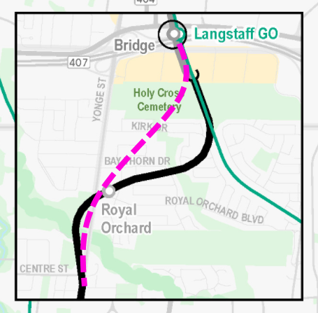 That's something that confuses me: why is it a requirement to not go underneath the cemetery if it is constructed with TBMs? It's not like any corpses will need to be reinterred or if there would be any property impacts. A better alignment would be to cross the cemetery diagonally and then have the curve/portal in the Langstaff lands. E.g. like this in pink: