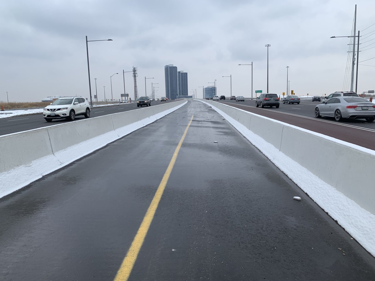 I found the bus lane to help a lot to buffer traffic from the median area, especially since bus frequencies are so low. It felt sketchy enough as it is, if traffic was right beside the barrier it would have felt very unsafe.