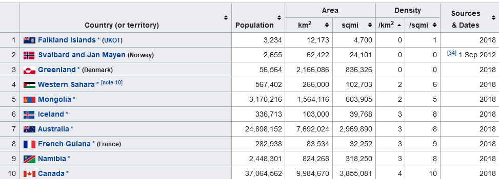 Note, the columns are City/Country/Population/Area/Density per Km2
